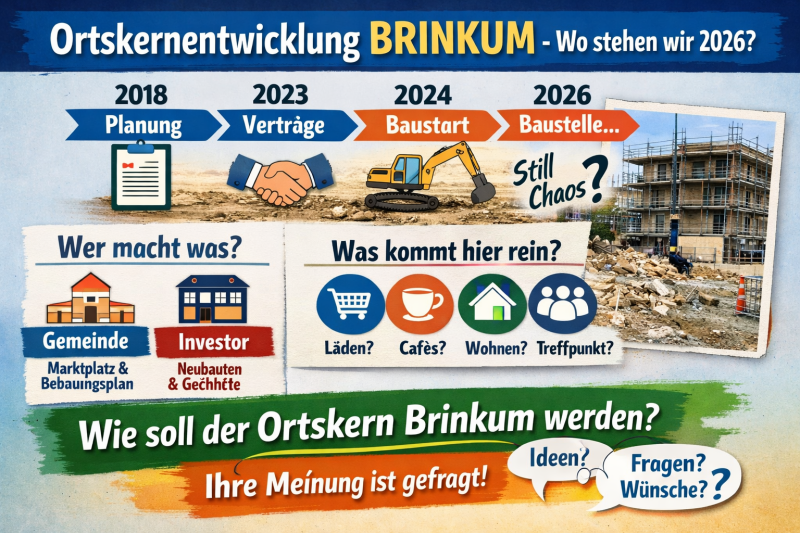 Die Entwicklung des Ortskerns Brinkum ist eines der wichtigsten städtebaulichen Projekte in unserer Gemeinde. Der neue Marktplatz und die umliegenden Gebäude sollen langfristig ein lebendiges Zentrum schaffen – einen Ort, an dem Menschen sich treffen, einkaufen, essen gehen und gemeinsam Zeit verbringen können.